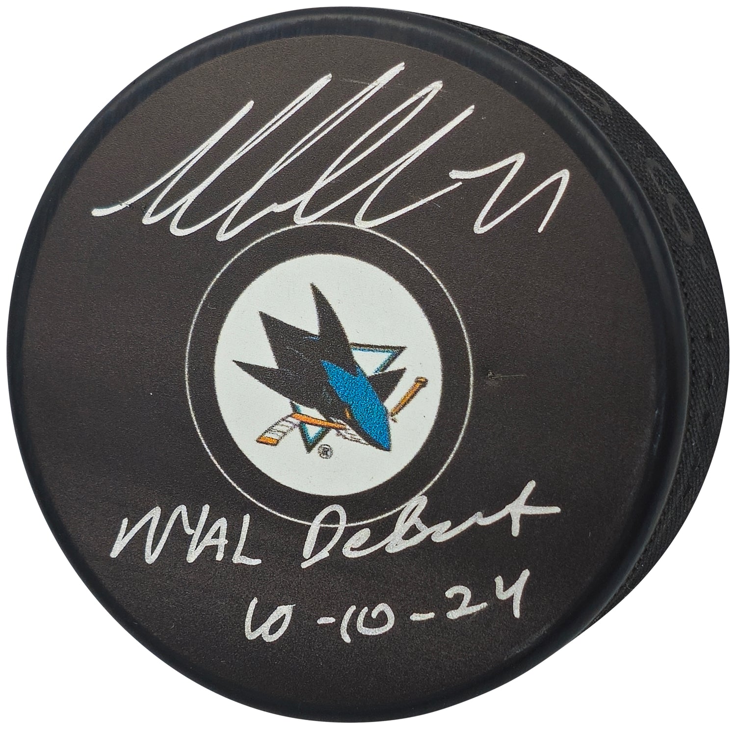 Own a piece of hockey history with this Official San Jose Sharks Logo Hockey Puck, hand-signed by Macklin Celebrini. This unique collectible is inscribed with "NHL Debut 10-10-24," commemorating his first NHL game—a must-have for Sharks fans and memorabilia collectors.