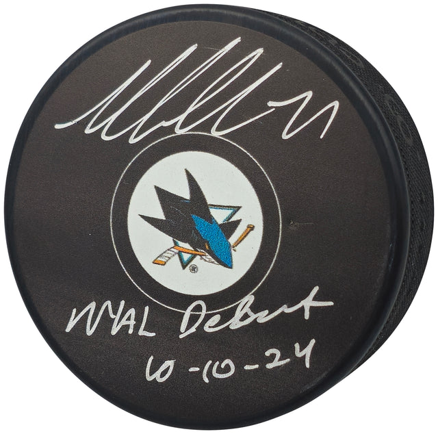 Macklin Celebrini Autographed Official San Jose Sharks Logo Hockey Puck "NHL Debut 10-10-24" Fanatics Holo Stock #236539
