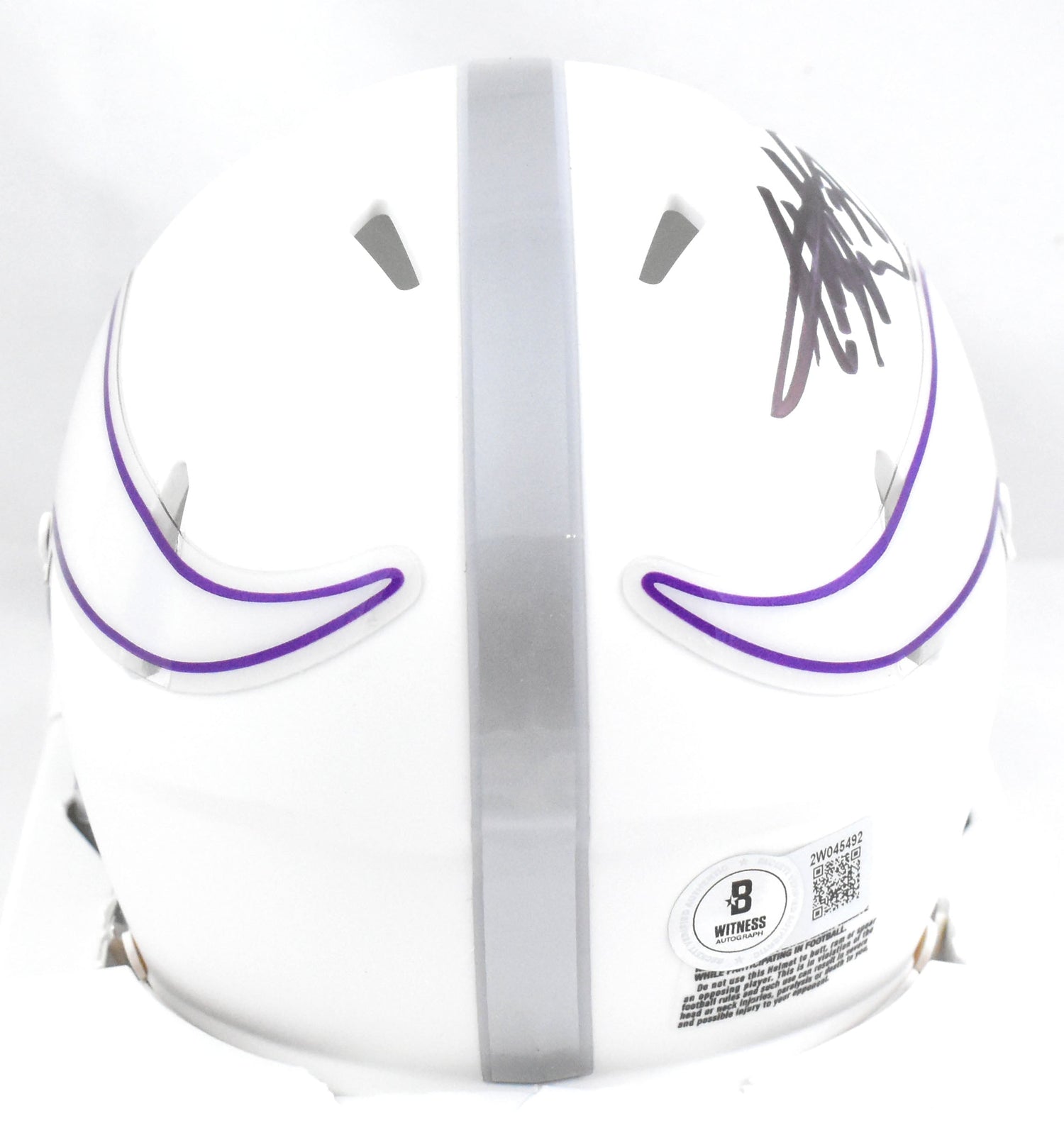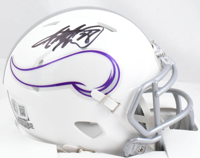 This authentic Adrian Peterson autographed Minnesota Vikings 2024 Riddell Alternate Speed Mini Helmet is a must-have addition for any football memorabilia collection. Known as one of the most dominant running backs in NFL history, Adrian Peterson left an indelible mark during his time with the Minnesota Vikings, earning accolades such as 2012 NFL MVP and countless Pro Bowl appearances. Now, fans have the opportunity to own a piece of his legacy with this officially signed item. Each mini helmet features a genuine Peterson autograph, certified by Beckett Witnessed Authentication. This means a Beckett representative personally witnessed the signature, ensuring authenticity and peace of mind for collectors. A unique numbered hologram and QR code allow for easy verification on the Beckett website, where you can see when and where the item was signed —either at a public signing event or a private appearance.