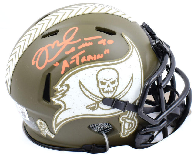 Own a piece of Tampa Bay Buccaneers history with this Mike Alstott hand-signed Riddell Salute to Service Speed Mini Helmet. A true fan favorite, Alstott—known as "A-Train"—is a legendary fullback who helped define the Buccaneers' dominant ground game. This unique collectible stands out with his autograph and the exclusive "A Train" inscription, adding extra significance for fans and collectors alike.