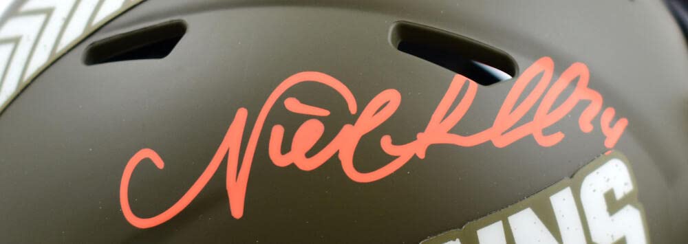 Own a piece of Cleveland Browns history with this Nick Chubb autographed Riddell Salute to Service Speed Mini Helmet. A must-have for any dedicated fan or collector, this signed mini helmet celebrates Chubb's contributions to the Browns while honoring the NFL's Salute to Service initiative.