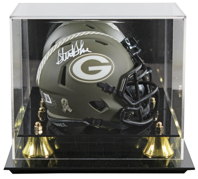Celebrate the legacy of a Green Bay Packers legend with this Autographed Alternate Salute to Service Speed Mini Helmet, personally signed by Sterling Sharpe, one of the most dynamic wide receivers in NFL history. A fan favorite from the late 1980s and early 1990s, Sharpe played his entire career with the Green Bay Packers and earned five Pro Bowl selections before his career was cut short by injury. This collectible honors his contributions to Packers history and America's heroes, featuring the patriotic Salute to Service design and presented in a striking UV mirrored back acrylic display case — perfect for showcasing in your home, office, or sports cave.