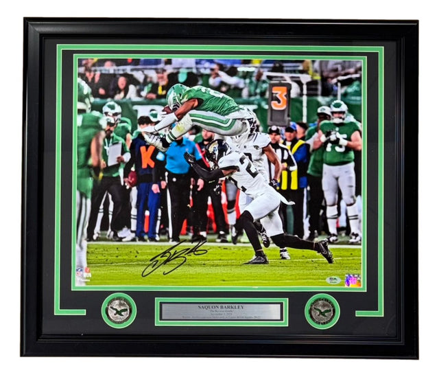 Saquon Barkley Signed Framed 16x20 Eagles Reverse Hurdle Photo PSA/DNA