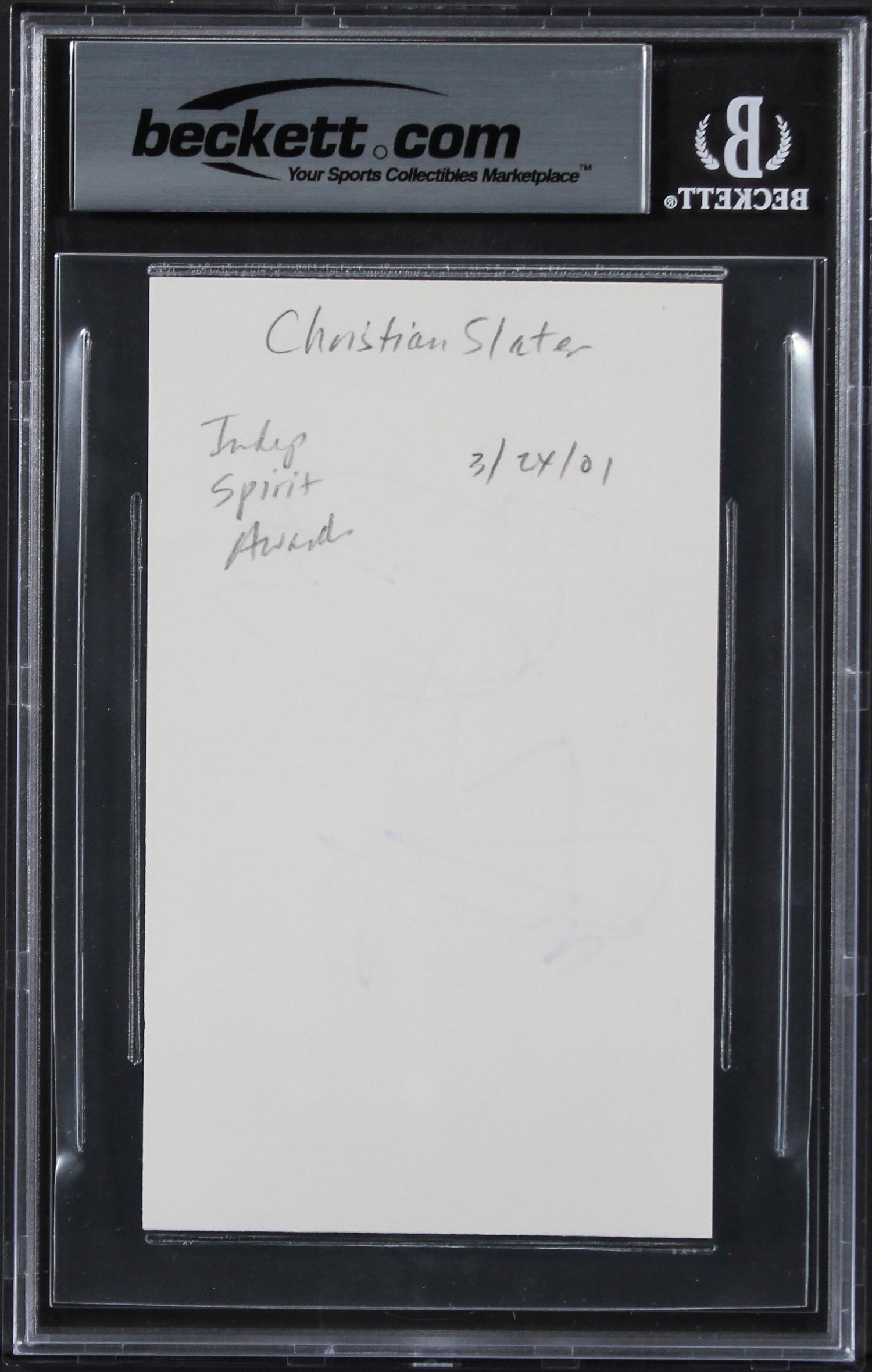 Own a piece of Hollywood history with this Christian Slater Autographed 3x5 Index Card, personally signed by the acclaimed actor known for his role in *Mr. Robot*. This collectible is 100% authentic, professionally slabbed and certified by Beckett Authentication Services (BAS), ensuring its legitimacy for serious collectors and fans alike.