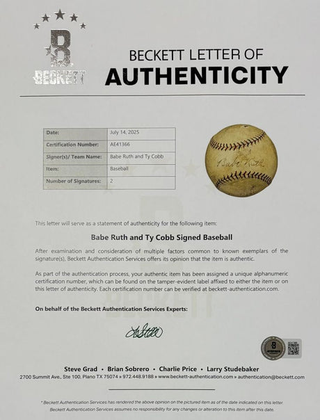 Very low stock (1 unit)$21,679Unit price /UnavailableBabe Ruth Ty Cobb Signed Official American League Baseball PSA+BAS LOA