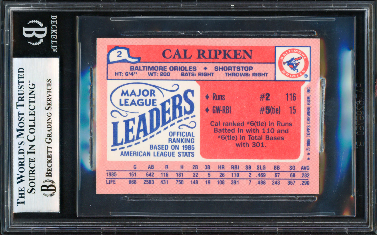 Own a piece of baseball history with this 1986 Topps Mini Card #2 autographed by Hall of Famer Cal Ripken Jr., one of the most iconic figures in MLB history. This collectible celebrates Ripken’s durability and legendary career with the Baltimore Orioles, highlighted by his record-breaking consecutive games streak that earned him the nickname "The Iron Man." This vintage card has been hand signed by Cal Ripken Jr. and authenticated by Beckett Authentication Services (BAS), ensuring you're investing in a 100% genuine piece of sports memorabilia. Encapsulated in BAS’s tamper-proof holder, this collectible is preserved for display and long-term value.