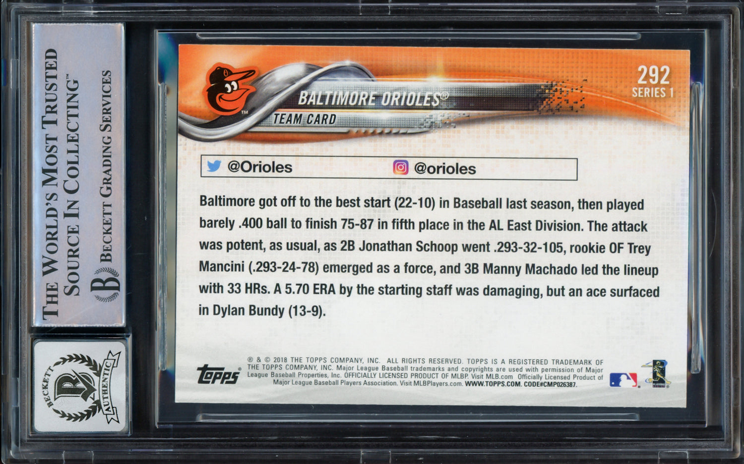 Manny Machado Autographed 2018 Topps Card #292 Baltimore Orioles Auto Grade Gem Mint 10 Beckett BAS Stock #228985