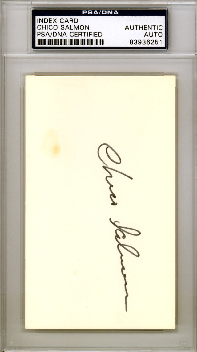Whether you're an avid baseball memorabilia collector or a fan of Chico Salmon’s career, this signed index card is a unique addition to any collection. Secure this authenticated signature today!