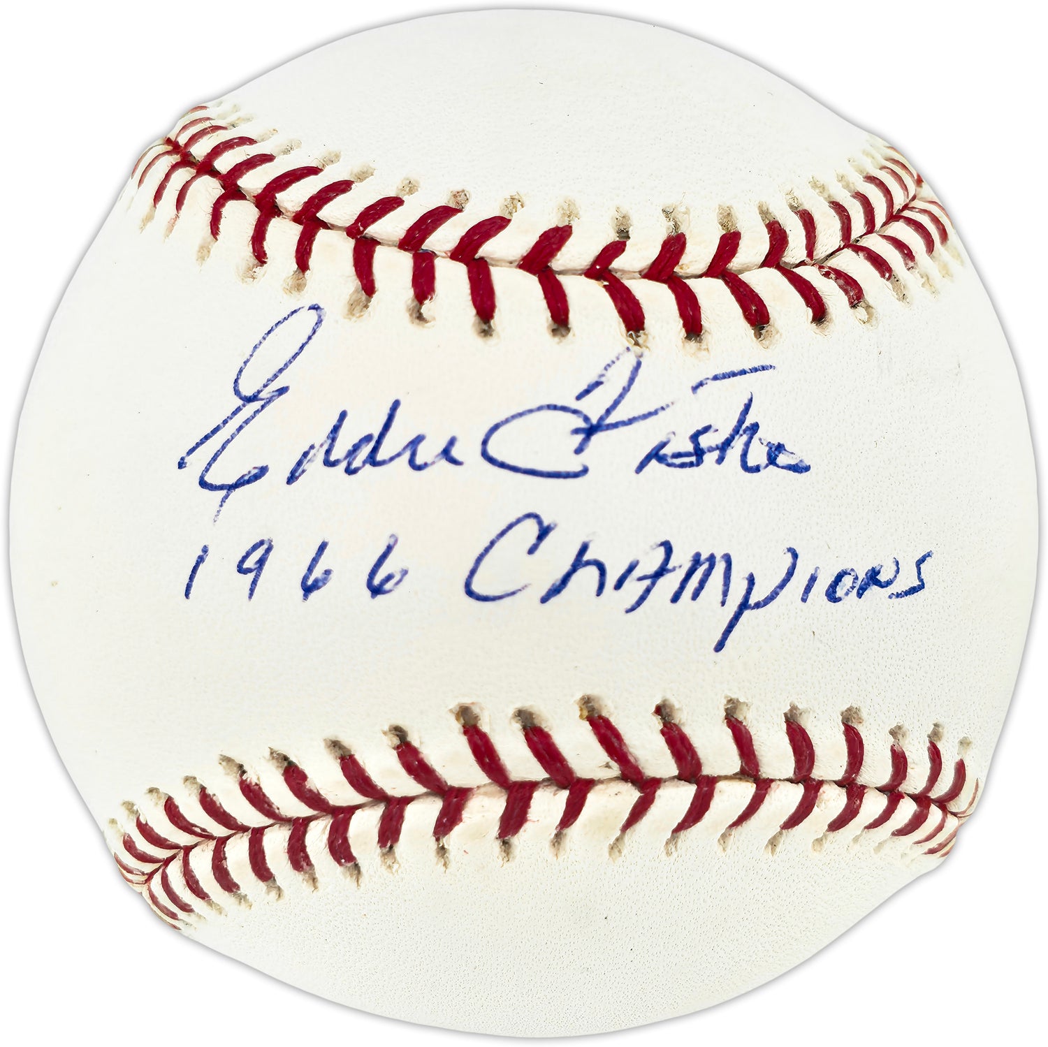 Celebrate a pivotal moment in baseball history with this Official MLB Baseball hand-signed by Eddie Fisher, inscribed with "1966 Champions." Fisher played a key relief pitching role for the Baltimore Orioles during their unforgettable 1966 season, when they swept the Los Angeles Dodgers to secure their first-ever World Series title. This autographed ball is a must-have for memorabilia collectors and Orioles fans who appreciate the rich legacy of baseball's golden era. Authenticated by Beckett Authentication Services (BAS), this collectible includes a tamper-proof QR Code hologram, ensuring its legitimacy and value. Add a rare piece of championship history to your collection today.