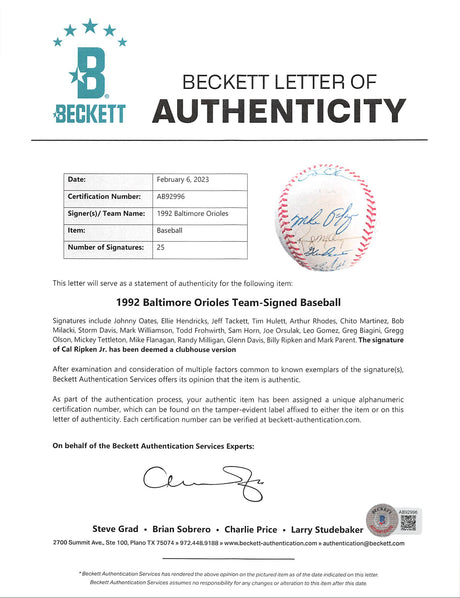 1992 Orioles (25) Oates, Tettleton, Ripken +22 Signed Oal Baseball BAS #AB92996