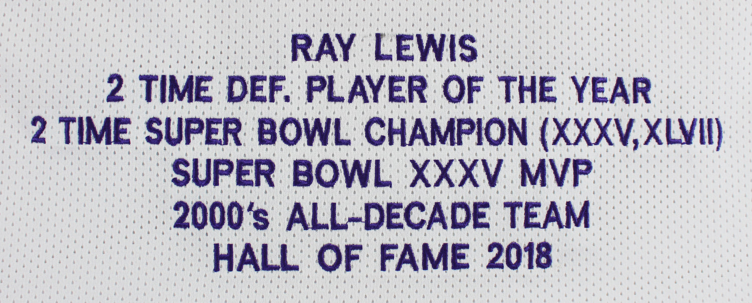 Own a piece of football history with this Autographed White Pro Style Embroidered Stat Jersey, personally signed by Ray Lewis of the Baltimore Ravens. A must-have for collectors and fans, this jersey celebrates the legacy of one of the greatest linebackers in NFL history. Fully authenticated for peace of mind, this signed jersey is the perfect addition to any memorabilia collection.