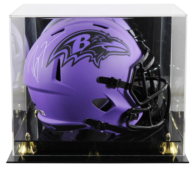 Celebrate the legacy of a Baltimore Ravens icon with this Autographed Alternate Rave Riddell Full Size Speed Rep Helmet, personally signed by legendary linebacker Ray Lewis. This striking helmet comes complete with a UV mirrored back acrylic display case, making it a showstopping centerpiece for any sports memorabilia collection. Whether you're a diehard Ravens fan or an NFL history enthusiast, this signed helmet offers both visual impact and authentic value. Officially authenticated through the Beckett Authentication Services (BAS) Witnessed Protection Program, this item includes a tamper-proof BAS sticker with a scannable QR code—ensuring 100% authenticity and peace of mind for collectors. Please note: Beckett no longer provides serial-numbered COA cards; the affixed authentication sticker serves as your complete proof of authenticity.