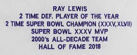 Ravens Ray Lewis Authentic Signed White Pro Style Stat Jersey BAS Witnessed