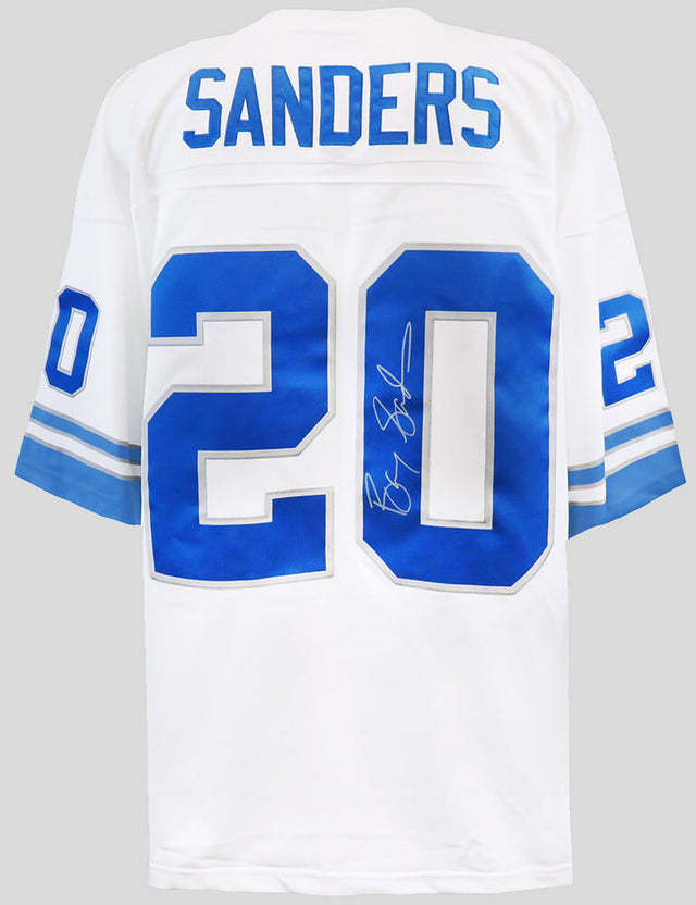 Barry Sanders Signed Detroit Lions white 1996 throwback Mitchell & Ness NFL Legacy football jersey. Item comes with a Schwartz Sports Memorabilia tamper-proof numbered hologram and Certificate of Authenticity which can be verified online.