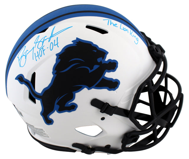 Own a piece of football history with this Barry Sanders Autographed Alternate Lunar Riddell Authentic Full-Size Speed Proline Helmet, complete with the inscriptions "HOF 04" and "The Lion King." This signed helmet is a must-have for Detroit Lions fans and serious sports memorabilia collectors.