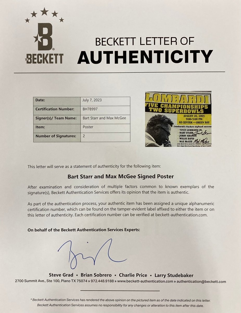 - Hand-signed by Bart Starr & Max McGee – Two key figures in the Packers' championship history.