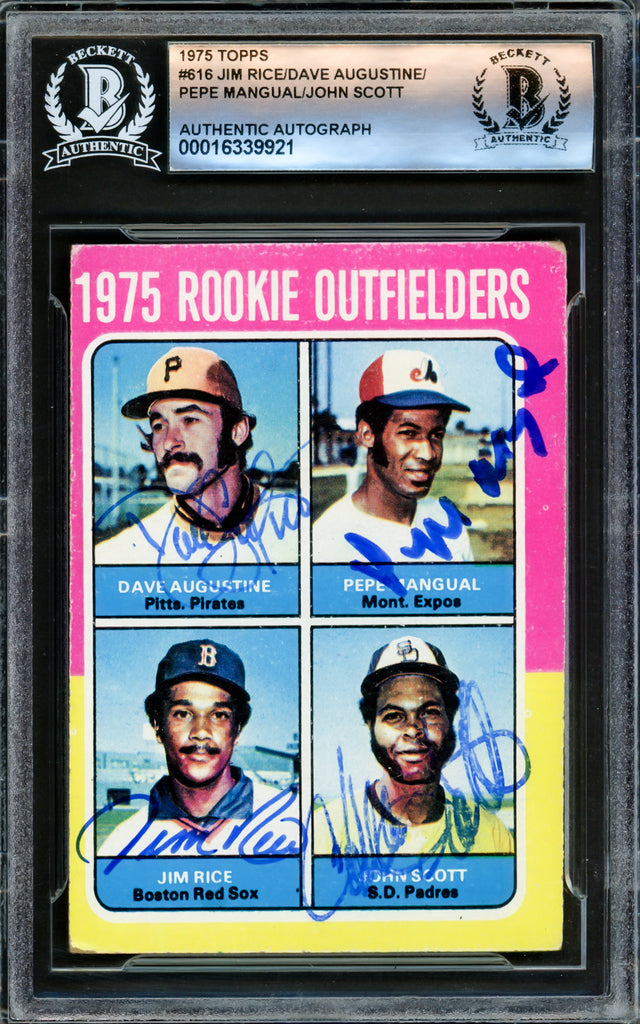 This 1975 Topps Rookie Card #616 is a must-have for serious baseball card collectors and sports memorabilia enthusiasts. Featuring the hand-signed autographs of Jim Rice, Dave Augustine, Pepe Mangual, and John Scott, this rare collectible captures an era of baseball history. Authenticated by Beckett Authentication Services (BAS), it is securely encapsulated in their tamper-proof holder for long-term preservation.
