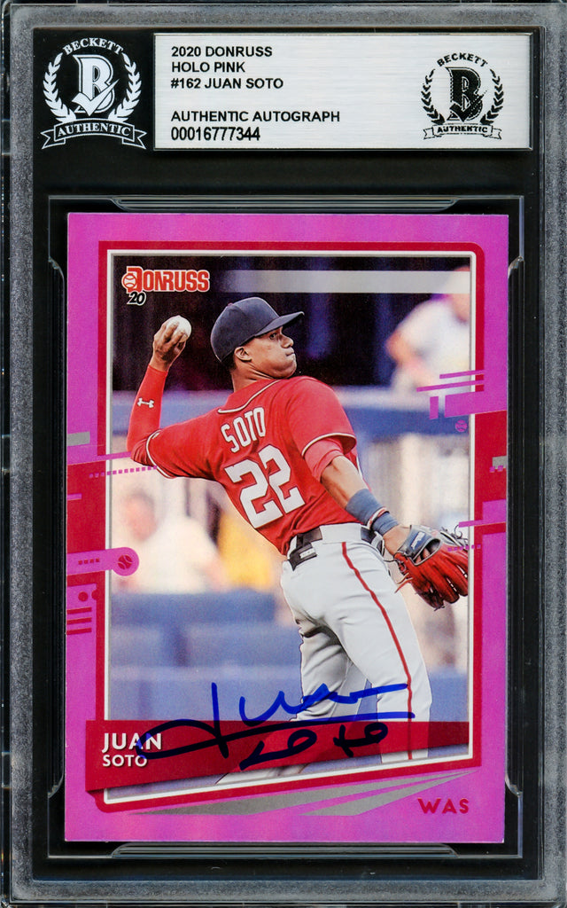 Own a piece of baseball history with this 2020 Donruss Holo Pink Variation Card #162, personally hand-signed by Juan Soto. A standout collectible for fans and investors alike, this rare card captures Soto’s rise as one of the game's brightest stars. Authenticated by Beckett Authentication Services (BAS), it is securely encapsulated in their tamper-proof holder, ensuring long-term protection and value.