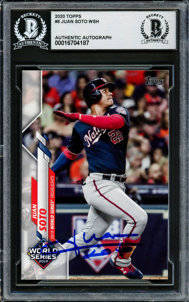 Own a piece of baseball history with this 2020 Topps Card #6, personally hand-signed by Juan Soto. A rising star and a World Series champion, Soto's signature adds incredible value to this collectible. Certified authentic by Beckett Authentication Services (BAS), this signed card comes encapsulated in BAS's tamper-proof holder, ensuring its long-term preservation.