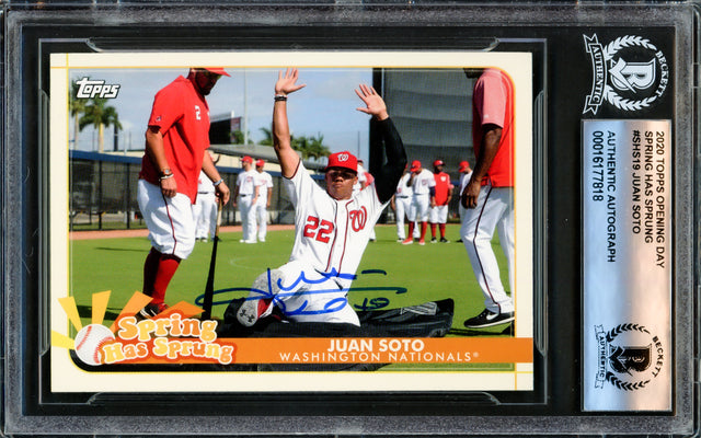 Own a piece of baseball history with this 2020 Topps Opening Day Spring Has Sprung Card #SHS-19, hand-signed by superstar Juan Soto. Recognized as one of the most electrifying young talents in the game, Soto played a key role in shaping the modern era of baseball with his clutch performances and undeniable skill. This collectible has been professionally authenticated by Beckett Authentication Services (BAS) and comes encapsulated in their tamper-proof holder, ensuring its authenticity and long-term protection. Perfect for devoted Washington Nationals fans, baseball collectors, and investors looking to add a valuable signed card to their collection. Key Features: