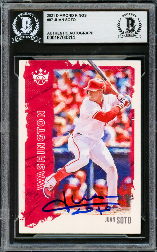 Own a piece of baseball history with this 2021 Donruss Diamond Kings Card #87, hand-signed by Juan Soto—one of the game’s brightest stars. This collectible card is authenticated by Beckett Authentication Services (BAS) and comes securely encapsulated in a tamper-proof holder, ensuring its long-term preservation and value.