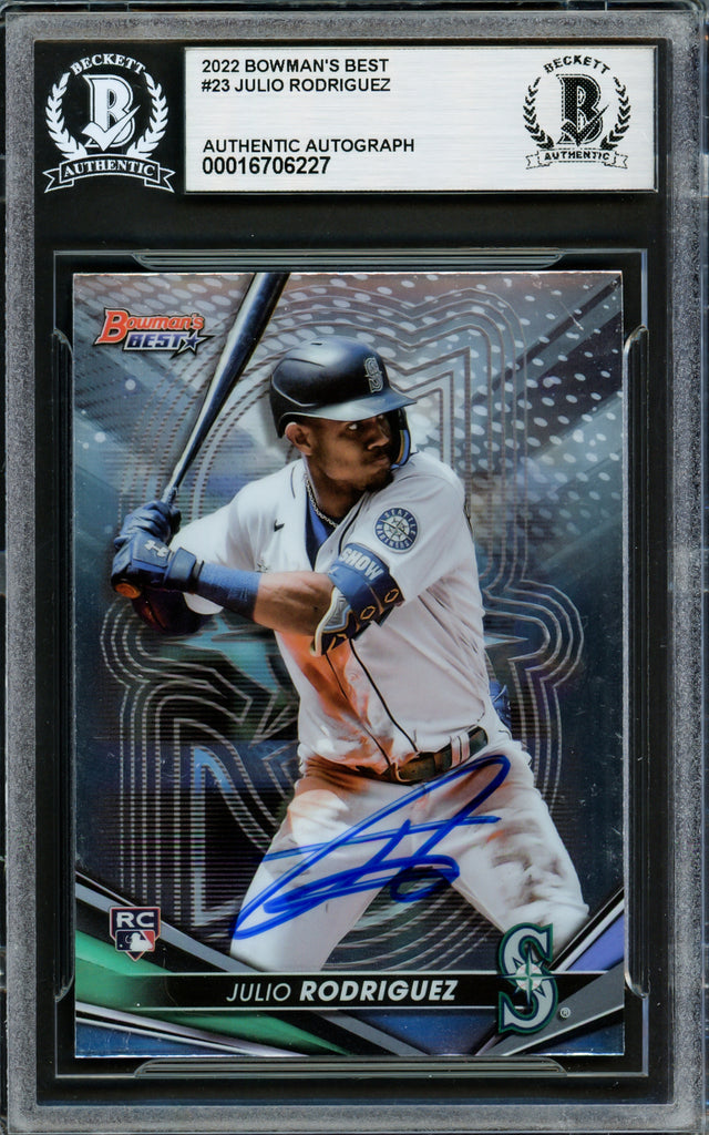 Own a piece of baseball history with this 2022 Bowman's Best Rookie Card #23, hand-signed by Julio Rodriguez—one of the most electrifying young stars in the game. This highly coveted rookie card has been certified authentic by Beckett Authentication Services (BAS) and comes securely encapsulated in a tamper-proof holder, ensuring its long-term value and protection.