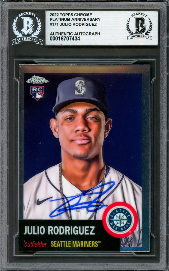 Julio Rodriguez Autographed 2022 Topps Chrome Platinum Anniversary Rookie Card #171 Seattle Mariners Beckett BAS Stock #228024 is backordered and will ship as soon as it is back in stock.
