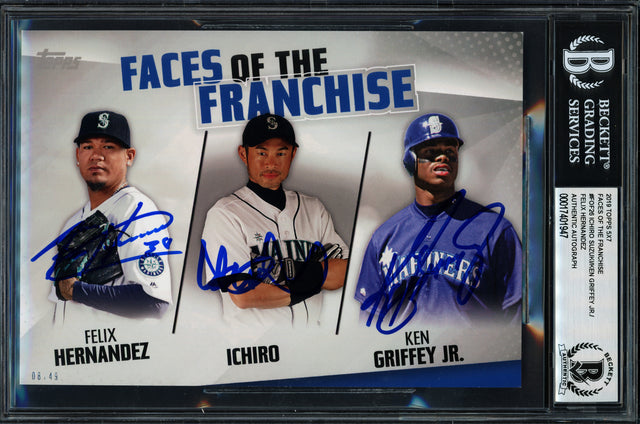Ken Griffey Jr., Ichiro Suzuki & Felix Hernandez Autographed 2019 Topps Faces of the Franchise 5x7 Card #FOF-26 Seattle Mariners #8/49 Beckett BAS #17401947