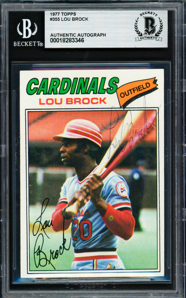 Lou Brock Autographed 1977 Topps Card #355 St. Louis Cardinals Beckett BAS #18283346