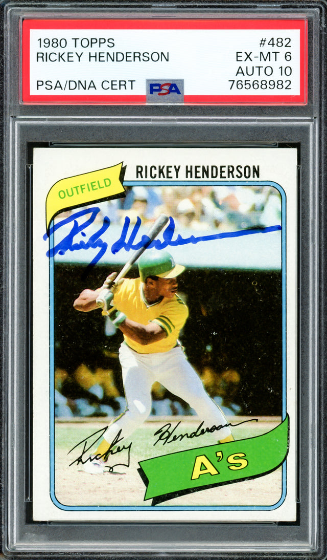Rickey Henderson Autographed 1980 Topps Rookie Card #482 Oakland A's PSA 6 Auto Grade Gem Mint 10 PSA/DNA #76568982