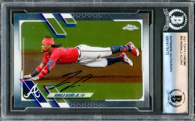 Ronald Acuna Jr. Autographed 2021 Topps Chrome Card #50 Atlanta Braves Beckett BAS #16175172 is backordered and will ship as soon as it is back in stock.