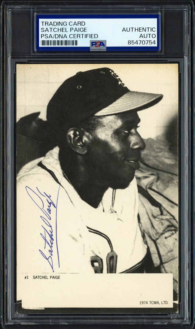 Own a piece of baseball history with this hand-signed 1974 TCMA Card featuring the legendary Satchel Paige. Measuring approximately 3.5x5.5 inches, this vintage collectible celebrates one of the most iconic figures in the game. Known for his incredible pitching career in both the Negro Leagues and Major League Baseball, Satchel Paige is a Hall of Famer and trailblazer in baseball history. This card has been certified authentic by PSA/DNA and is securely encapsulated in their tamper-proof holder, ensuring protection and long-term value for collectors.