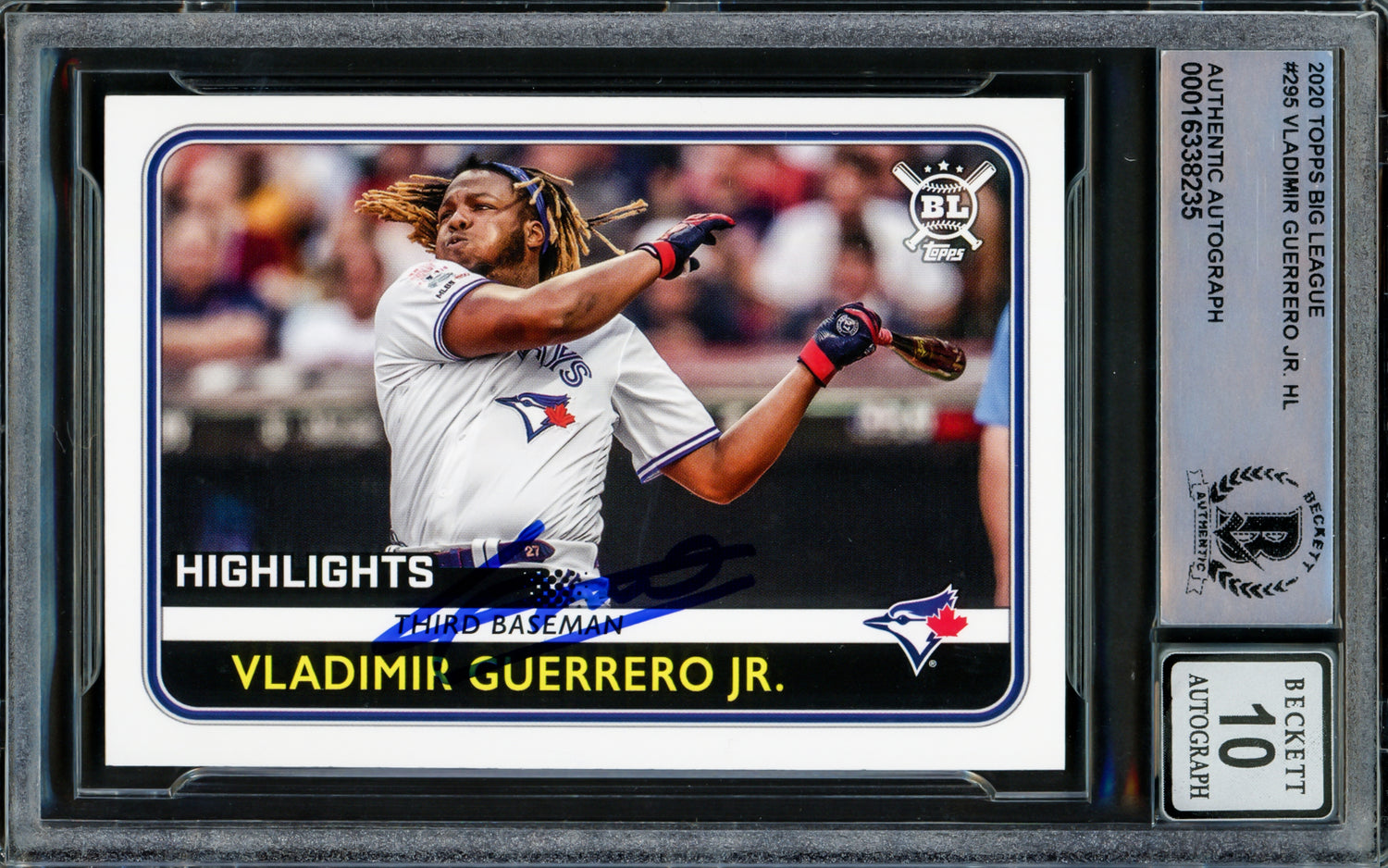 Own a piece of baseball history with this 2020 Topps Big League Card #295, hand-signed by Vladimir Guerrero Jr. This highly collectible card has been graded Gem Mint 10 by Beckett Authentication Services (BAS), ensuring the pristine quality of the autograph. Encapsulated in Beckett's tamper-proof holder, this authenticated gem is a must-have for serious collectors and fans of the Toronto Blue Jays' superstar.