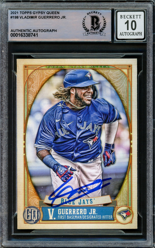 Own a piece of baseball history with this 2021 Topps Gypsy Queen Card #198, hand-signed by Vladimir Guerrero Jr. This highly sought-after collectible is a must-have for Blue Jays fans and baseball card enthusiasts. Professionally authenticated and encapsulated by Beckett Authentication Services (BAS), this card boasts a Gem Mint 10 signature grade, ensuring its pristine condition and long-term value.