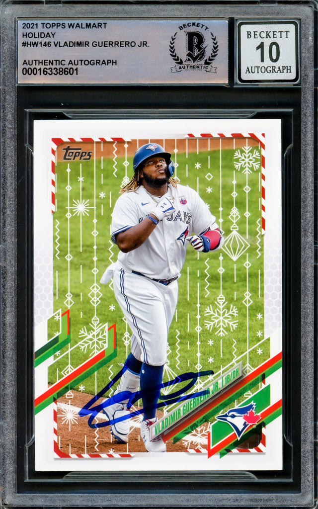 Whether you’re a dedicated fan of Vladimir Guerrero Jr. or a collector of graded baseball cards, this Beckett-certified autograph is an incredible investment. Don't miss the chance to add this 2021 Topps Holiday Vladimir Guerrero Jr. autographed card to your collection today!