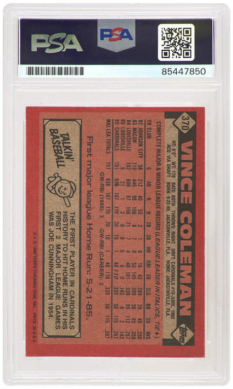 Vince Coleman Signed Cardinals 1986 Topps Baseball Trading Card #370 - (PSA Encapsulated)