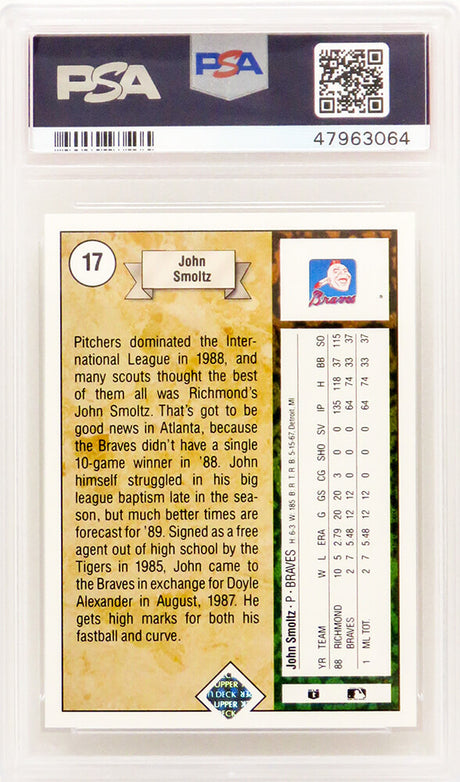 John Smoltz (Atlanta Braves) 1989 Upper Deck Baseball #17 RC Rookie Card - PSA 10 GEM MINT