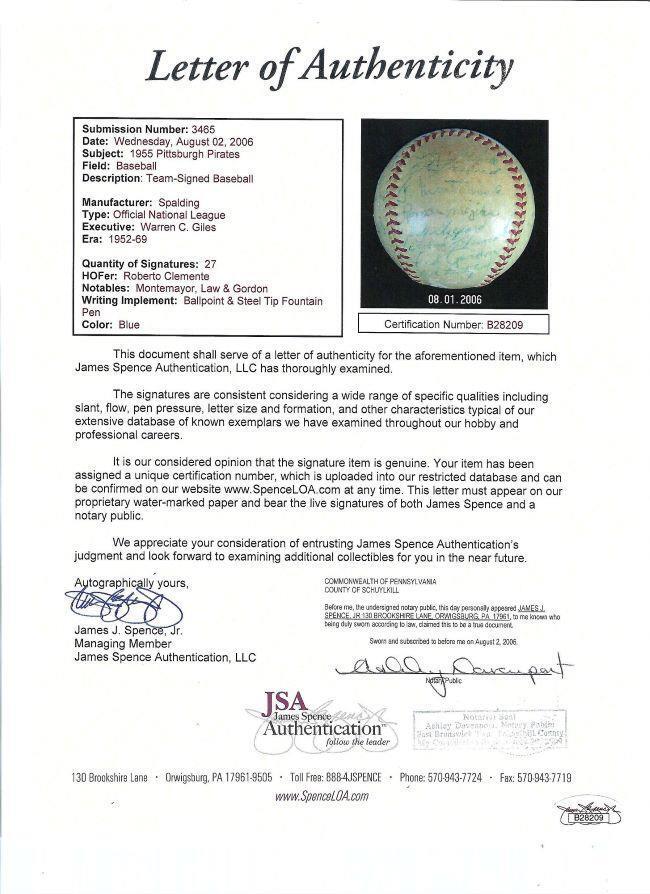 Own a remarkable piece of baseball history with this 1955 Pittsburgh Pirates team-signed official National League baseball. This extraordinary collectible features Roberto Clemente's rookie-year autograph, making it a must-have for serious collectors and Pirates fans. Authenticated by JSA with a hologram and letter of authenticity, this ball captures a defining moment in the early careers of legendary players.