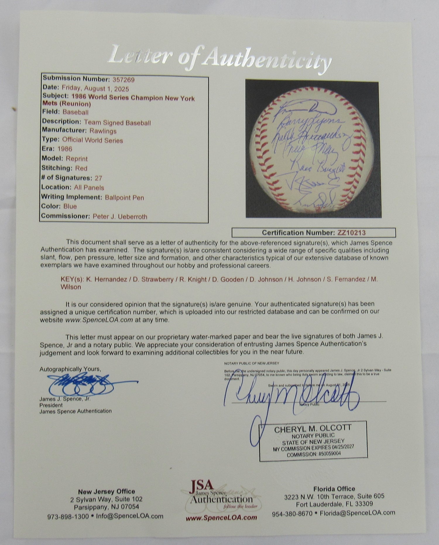 Celebrate one of baseball’s most unforgettable moments with this 1986 World Series Champion New York Mets Signed Auto Baseball, authenticated by JSA LOA ZZ10213. A true collector’s treasure, this baseball features 27 total signatures from the iconic roster that led the Mets to a dramatic victory over the Boston Red Sox, sealing a legendary place in MLB history. For fans of the New York Mets, this piece marks one of the franchise’s greatest triumphs and is a must-have centerpiece for any memorabilia collection.