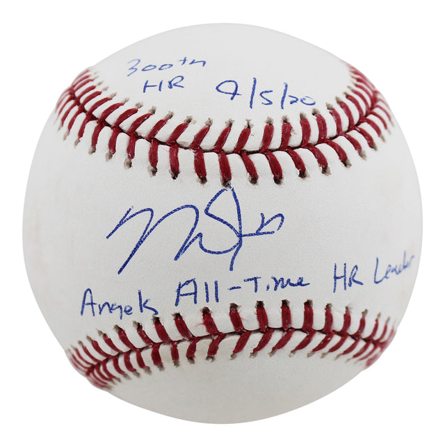 Own a piece of baseball history with this Mike Trout Autographed OML Baseball, featuring the exclusive inscription: "Angels All-Time Home Run Leader, 300th HR 9/5/20." A true collector's item, this baseball commemorates a milestone moment in Los Angeles Angels history, celebrating Trout’s legendary career.