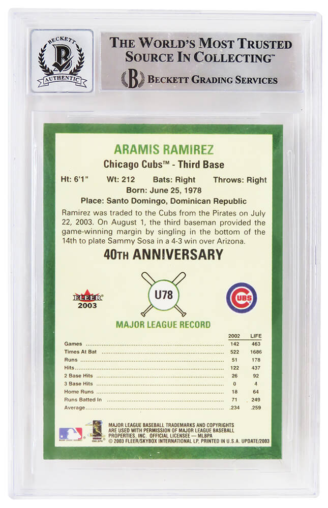 Aramis Ramirez Signed Chicago Cubs 2003 Fleer Tradition Update Baseball Card #78 - (Beckett - Auto Grade 10)