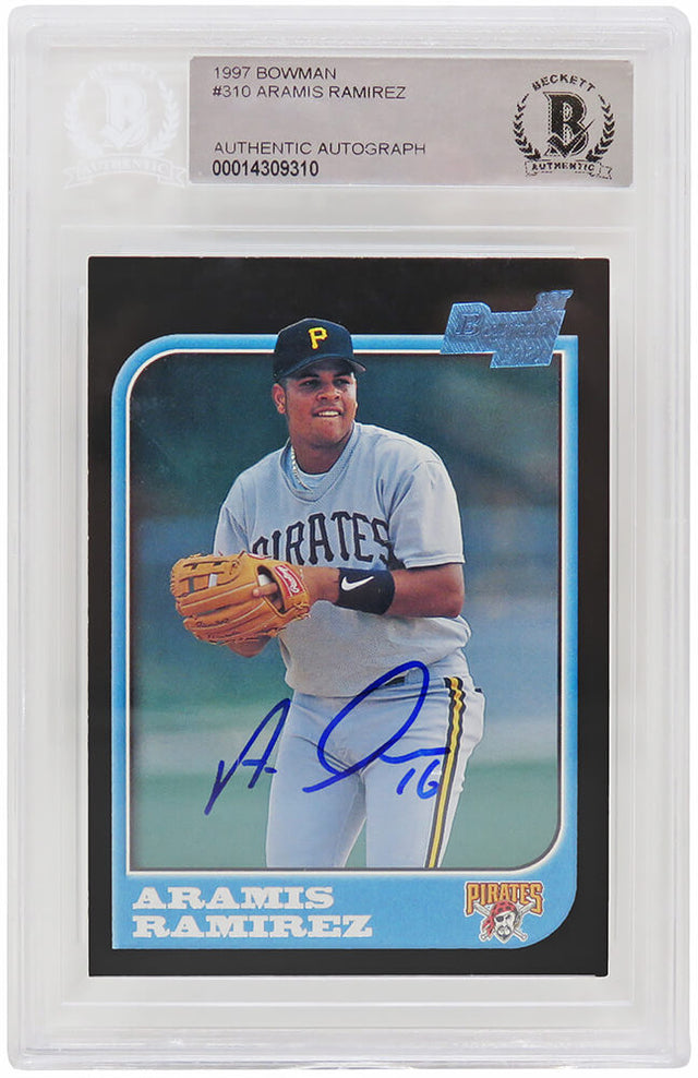 Own a piece of baseball history with this Aramis Ramirez signed Pittsburgh Pirates 1997 Bowman rookie baseball card #310. This coveted slabbed card is a must-have for serious collectors and Pirates fans alike. Professionally authenticated and encapsulated by Beckett Authentic, this card includes a unique authentication number that can be verified online, ensuring its genuine status.