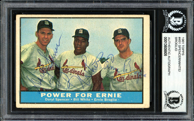 Bill White, Daryl Spencer & Ernie Broglio Autographed 1961 Topps Card #451 St. Louis Cardinals Beckett BAS #13608805