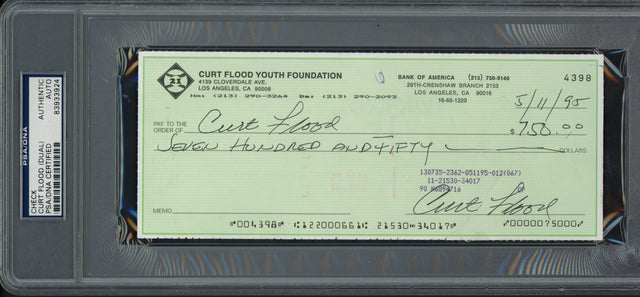 This rare collectible features a 3.5x8.5 check hand signed twice by Curt Flood, a legendary outfielder best known for his pivotal role in challenging Major League Baseball's reserve clause, helping pave the way for modern free agency. A standout with the St. Louis Cardinals, Curt Flood was a three-time All-Star and a key contributor to their 1964 and 1967 World Series Championship teams. This dual-signed piece offers exceptional historical relevance for collectors of sports memorabilia and civil rights history alike. Authenticated and encapsulated by PSA/DNA, this item ensures long-term preservation and authenticity verification.