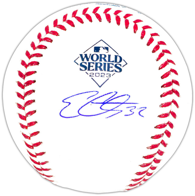 Evan Carter Autographed Official 2023 World Series Logo MLB Baseball Texas Rangers Beckett BAS Witness Stock #221324