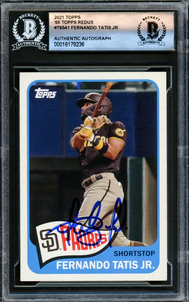 Own a piece of baseball history with this 2021 Topps 1965 Throwback Card #T65-41, hand-signed by Fernando Tatis Jr. This highly sought-after collectible is a must-have for Padres fans and serious memorabilia collectors. Professionally authenticated by Beckett Authentication Services (BAS), this card is encapsulated in their tamper-proof holder, ensuring its lasting value and protection.