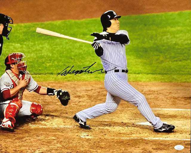 Celebrate one of the most iconic power hitters in New York Yankees history with this stunning Hideki Matsui signed 16x20 photo. A fan favorite both in Japan and the United States, Matsui played a pivotal role in the Yankees' success during the early 2000s, including his memorable MVP performance in the 2009 World Series. This authentic hand-signed photo is the perfect tribute to "Godzilla’s" legacy on and off the field and makes an outstanding centrepiece for any sports memorabilia collection. Authenticated by JSA (James Spence Authentication), it’s a must-have for serious collectors and devoted Yankees fans alike.