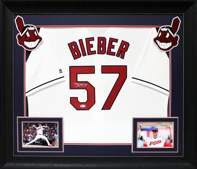 Indians Shane Bieber Signed White Majestic Cool Base Jersey Framed Jersey BAS