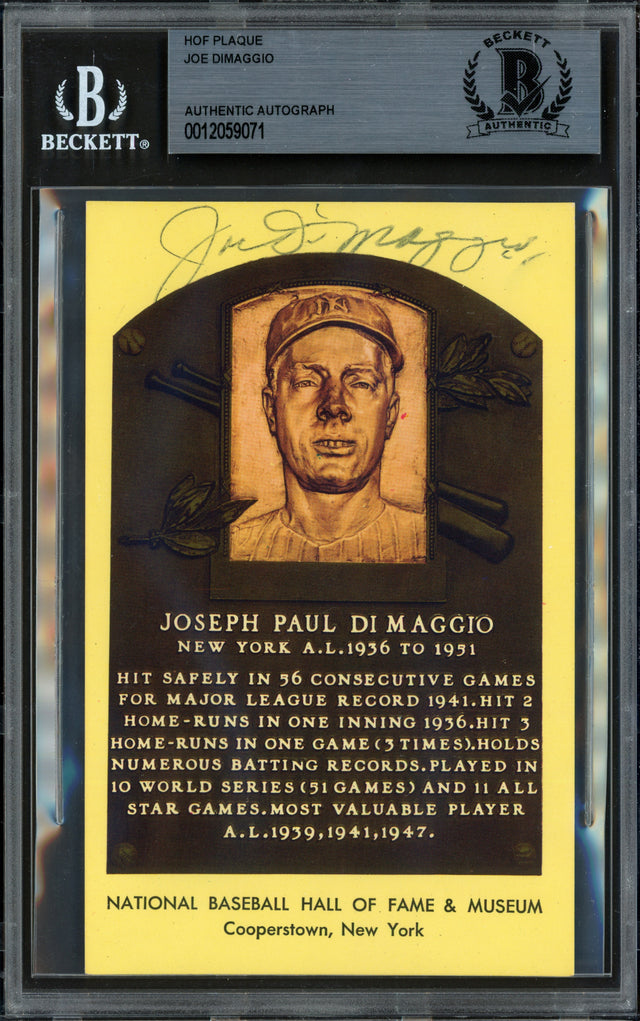 Joe DiMaggio Autographed Hall of Fame HOF Plaque Postcard New York Yankees Beckett BAS #12059071 is backordered and will ship as soon as it is back in stock.