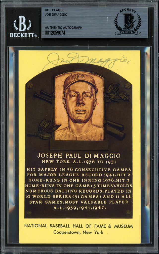 Joe DiMaggio Autographed Hall of Fame HOF Plaque Postcard New York Yankees Beckett BAS #12059074 is backordered and will ship as soon as it is back in stock.